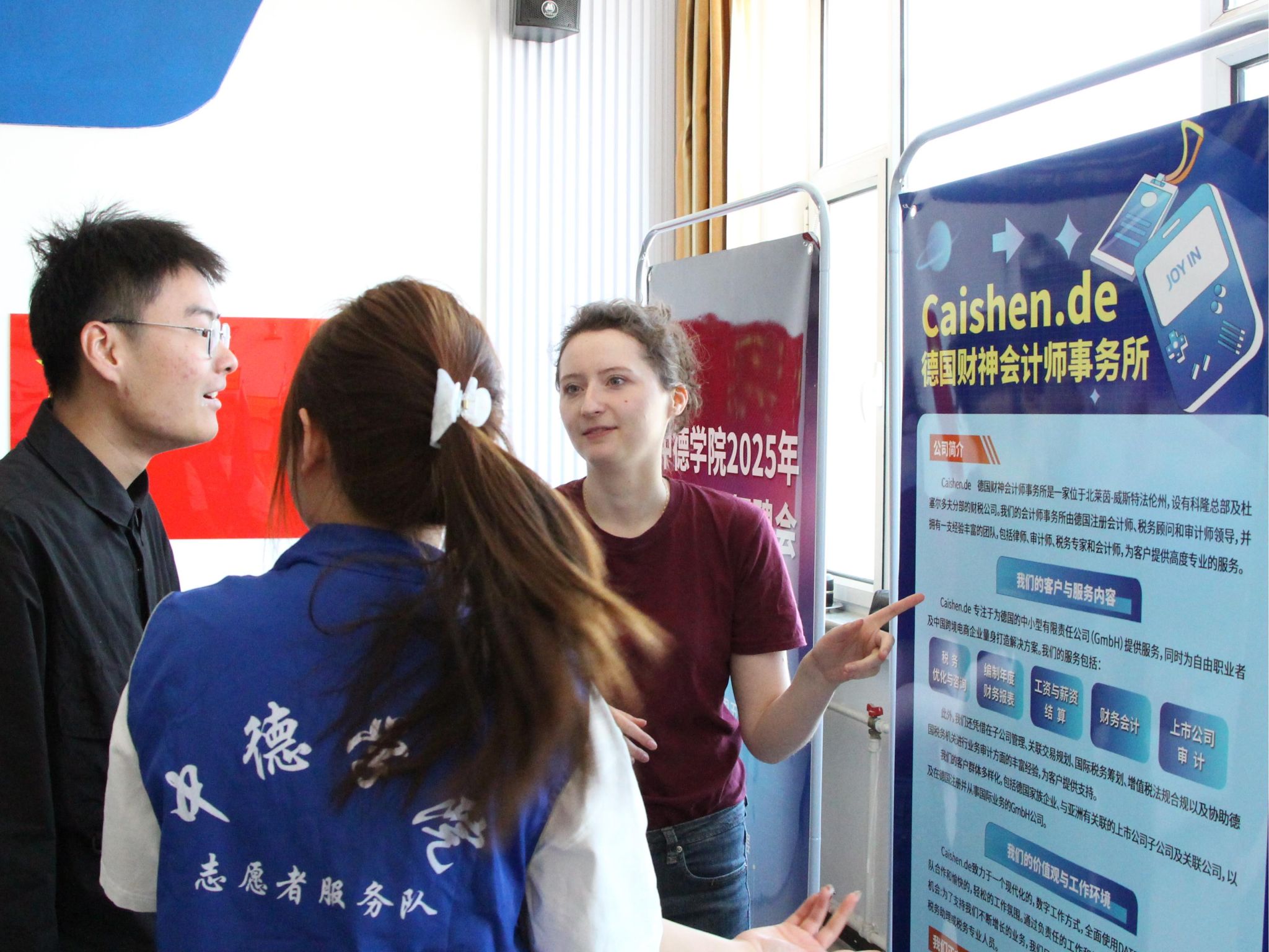 招聘会现场,企业代表通过发放宣传资料、现场宣讲等方式,详细介绍企业情况、岗位信息和发展空间,耐心解答学生疑问。Cai Shen会计师事务所负责人表示:“中德学院学生专业基础扎实、综合素质高,我们非常重视此次招聘会,希望能招聘到一批优秀的人才加入我们团队,为企业发展注入新的活力。”