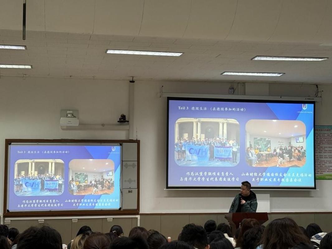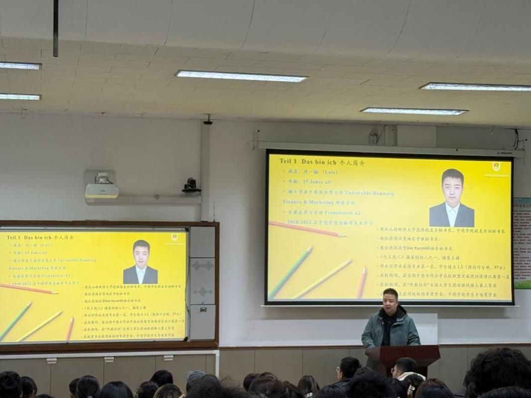 为深入贯彻立德树人根本任务,扎实推进学风建设,赋能学生成长成才,11月13日晚上,中德学院在坞城校区慎行101举办了2025级学生生涯规划沙龙(总第十三期)。本次分享会由中德学院2022届毕业生、德国汉堡大学研究生刘一楠结合自身学习及德国留学经历,从课程学习、留学准备、海外生活等多个维度展开,他以“从汾水河畔到莱茵之滨:我们的中德四年与德国之路”为题为在场同学提供了全面且实用的指导。讲座现场座无虚席,互动氛围热烈浓厚,让在场师生受益匪浅,为同学们的学业规划与留学筹备点亮了前行的灯塔。