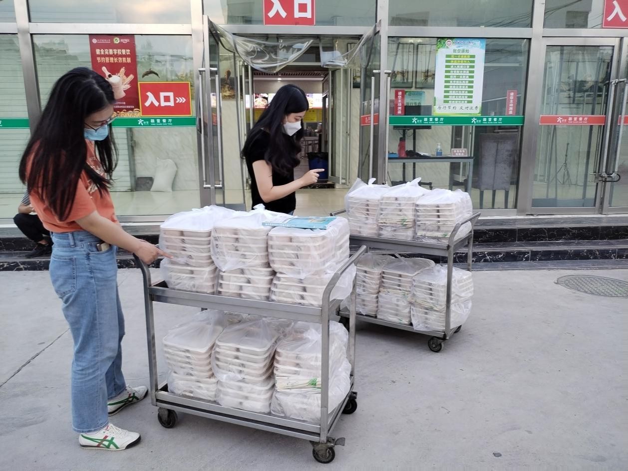 在接到学生返校的配餐任务后,中德学院党委书记刘臣洲第一时间安排布置,克服人员少、任务重等困难,在借鉴9月12日送餐经验的同时,协调学院各方力量,就配餐环节可能出现的细节问题反复推敲演练,确保配餐期间按点、有序、保量、有温度。每餐配送负责人及时与餐厅对接,各年级辅导员对每一位同学到校时间等信息清楚明了,对配餐数量、楼层分布、宿舍人数了然于心,尽全力做到既要保证送餐及时无误,又要保证饭菜热乎可口,确保人餐对应,减少不必要的浪费。
