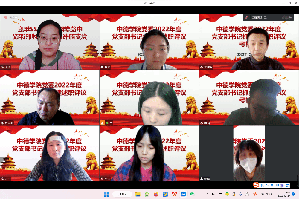 12月27日下午,中德学院党委召开2022年度党支部书记抓党建述职评议考核会议。学院党委书记刘臣洲,党委副书记、院长史贞,党委副书记郭建军,党政支部和学生党支部全体教工党员参加会议。会议由学院党委副书记郭建军主持。