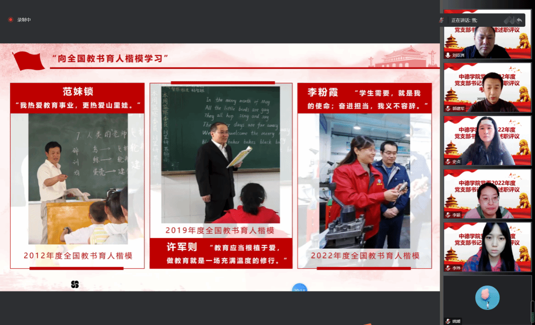 为充分发挥先进典型的示范引领作用,引导教师争做党和人民满意的“四有”好老师,营造尊师重教的良好风尚,12月27日下午,中德学院以线上方式开展主题党日活动,组织全体党员教师学习全国教书育人楷模先进事迹。学院党委书记刘臣洲、党委副书记、院长史贞、党委副书记郭建军以及党政支部和学生党支部全体教工党员参加会议。会议由学院党委副书记郭建军主持。
