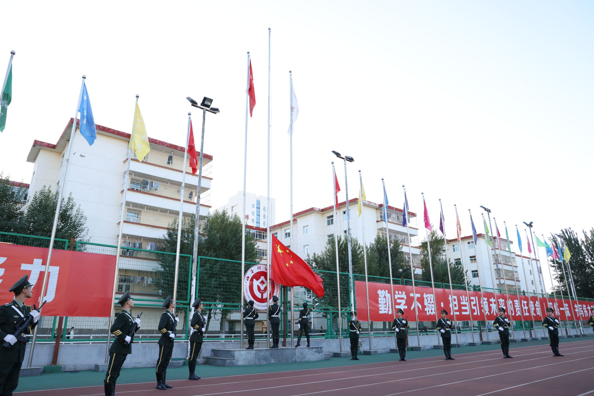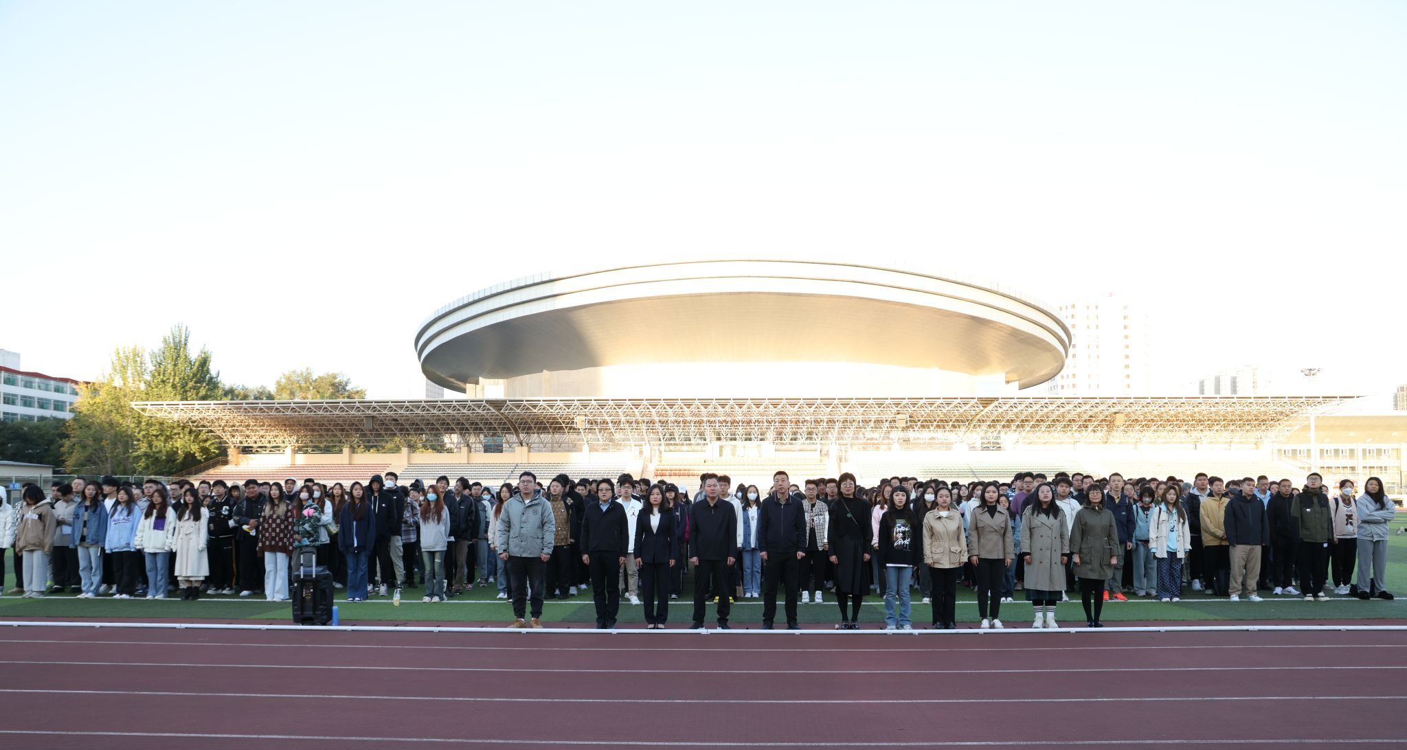 10月9日清晨,中德学院在坞城路校区体育场举行了庄严的升旗仪式,学院全体领导、教职员工和所有在校学生共同参加了升旗仪式。
