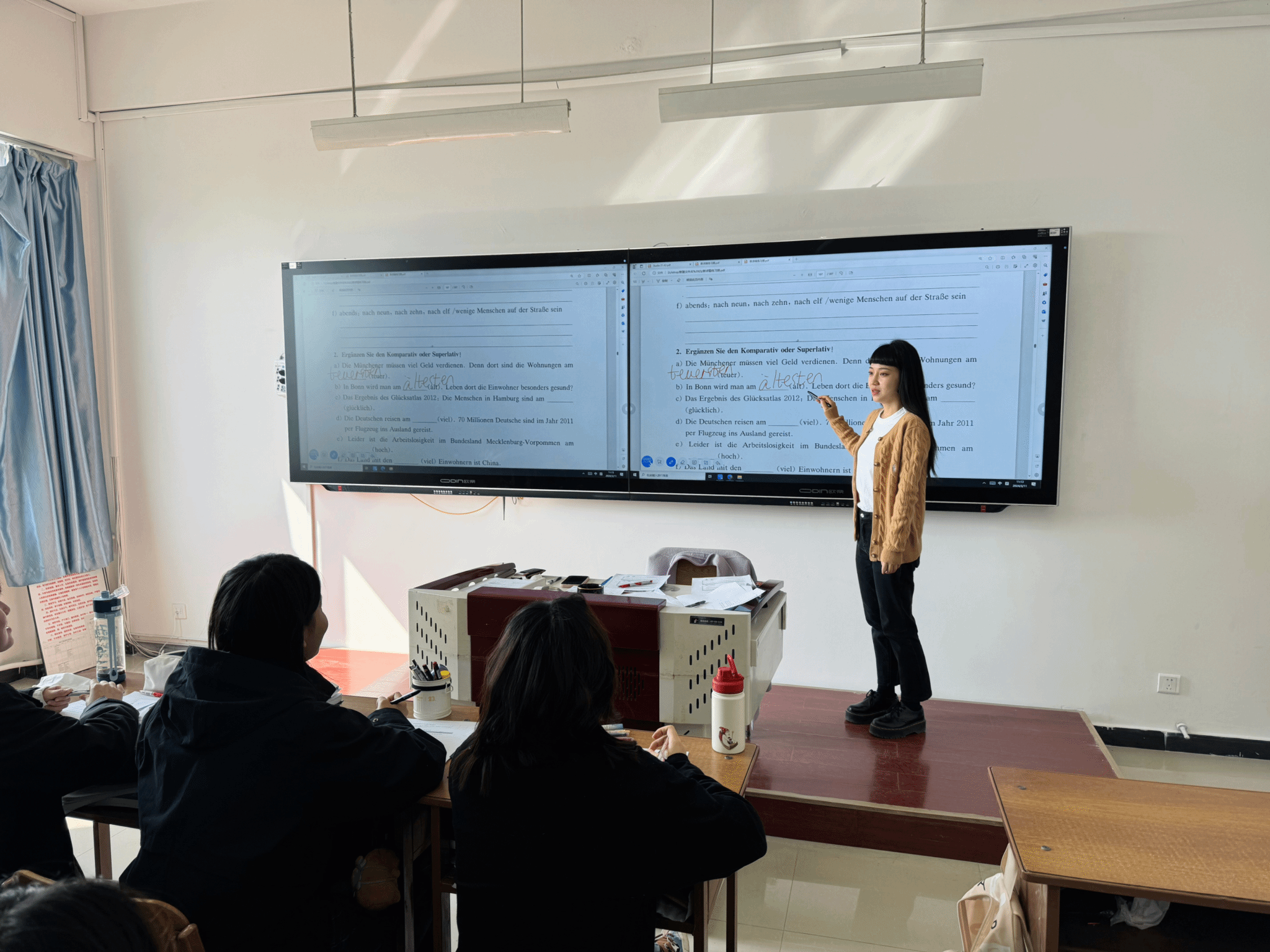 开学前一周,学院积极联系校教务部,组织相关人员对全体德语教师及教学管理人员进行新教学设备的操作培训,提升教师的教学设备操作能力,确保课堂教学质量。开学第一天,学院领导、教学督导人员与辅导员等进班查课听课,认真检查授课教师课程内容的教学设计,详细记录教师的教学行为与学生的课堂表现。中德学院开学初教学工作情况整体良好。授课教师提前到岗,课堂教学组织井然有序,课堂教学内容讲解清晰,同学们精神饱满,听课状态良好,课堂师生互动积极,学习气氛浓烈。