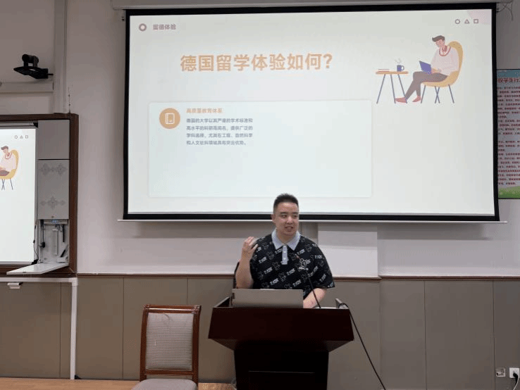 为了帮助同学们明确职业目标和方向,更好地实现就业选择和就业机会,5月15日晚,中德学院在慎行101教室成功举办了大学生职业规划专题系列讲座。此次讲座特邀请了2022届优秀毕业生刘一楠,就职业规划、行业趋势以及个人留德经验进行分享,2021级全体本科生参加了此次讲座。本次讲座由中德学院党委副书记郭建军主持。
