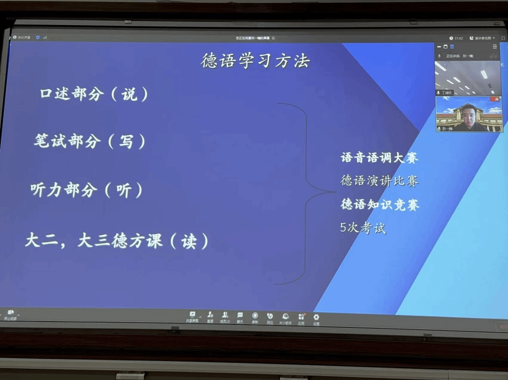 随后,2018级校友刘一楠通过线上的方式以“你的生活指南”为主题,从个人简介、学在中德、乐在中德、学习方法指南、答疑解惑五个方面进行了分享。刘一楠目前在德国汉堡大学读研,他给大一新生分享了自己在中德学院的学习经历,尤其是乐在中德,分享了中德学院形式多样的活动——中德文化节、德语角、德语学习经验分享会、Exzellenzprojekt、中德朗读者、学习沙龙、演讲比赛、语音语调大赛、篮球赛、足球赛、啦啦操比赛等独具中德特色的活动。分享了自己总结的德语及专业课程学习方法和经验,并告诫大家大一基础好,大二大三没烦恼,早睡早起身体好,课堂效率见奇效。