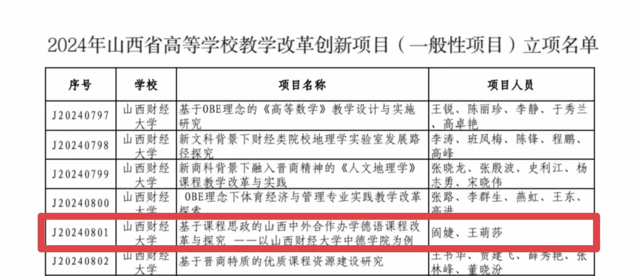 近日,山西省教育厅公布了2024年山西省高等学校教学改革创新项目立项名单,我院阎婕老师主持申报的教改课题《基于课程思政的山西中外合作办学德语课程改革与探究——以山西财经大学中德学院为例》成功获批为省级一般项目,并获校级重点项目立项支持,这是我院教改项目的再次立项。