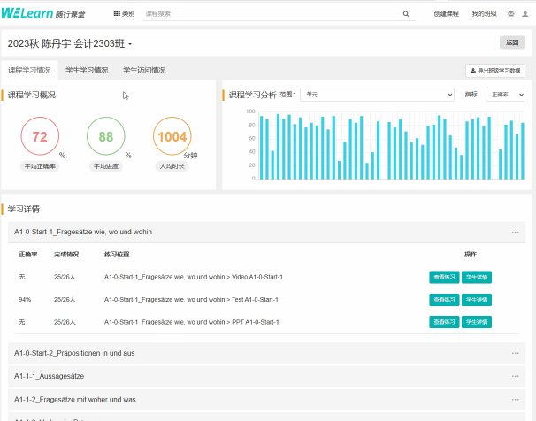 王秀娟副院长首先代表学院对陈丹宇老师的讲解表示欢迎和感谢。随后陈丹宇老师就双方均使用的《studio 21交际德语教程》(第二版)教材中涉及A1阶段语法的学习与操练在上外社App WE learn中的应用、其主要功能及她们团队在开发此微课应用的初衷和使用后的效果等方面做了逐一的介绍。面对课时紧、德语语法庞杂、教材无法完全覆盖、补充讲解占用课时多等一直存在的问题,她们通过PPT+讲稿+练习+视频的方式将语法教学内化到课前自学环节和课上检查答疑的过程中,针对教材中每个语法知识点共约15分钟的学习时长让学生在学中体会,用中加深,讲中掌握,以引导学生语法的习得。此微课应用不仅促进学生自主学习的习惯养成,教师也可通过后台数据建立学生学习台账,使教学更加可视化,以更好提高课堂效率。陈老师坦言,通过一年多来的试用,深感对教学促进不少。