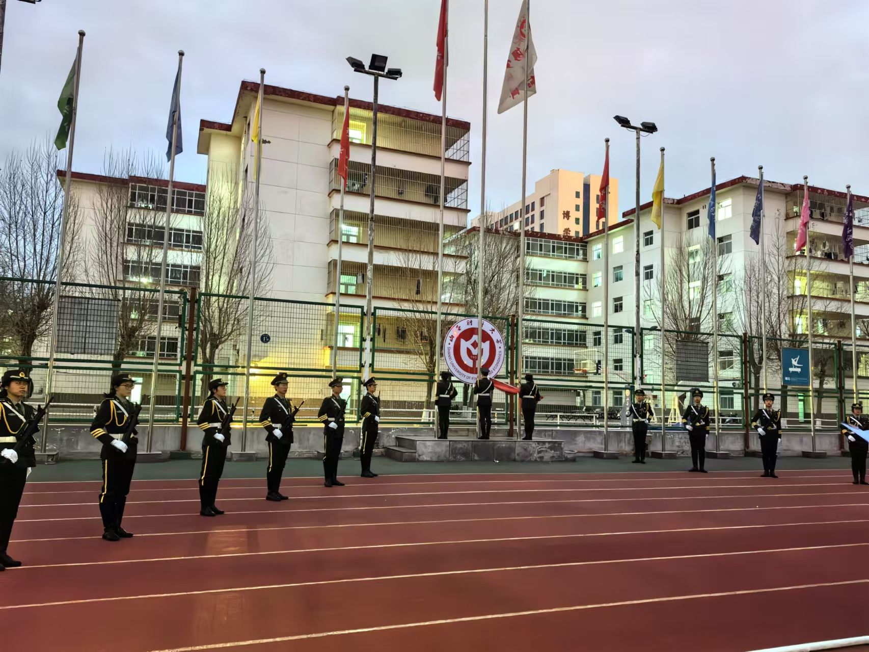 12月9日清晨,中德学院在坞城校区体育场举行了庄严隆重的升旗仪式,学院全体领导、教职工以及所有在校学生共同参加本次升旗仪式。