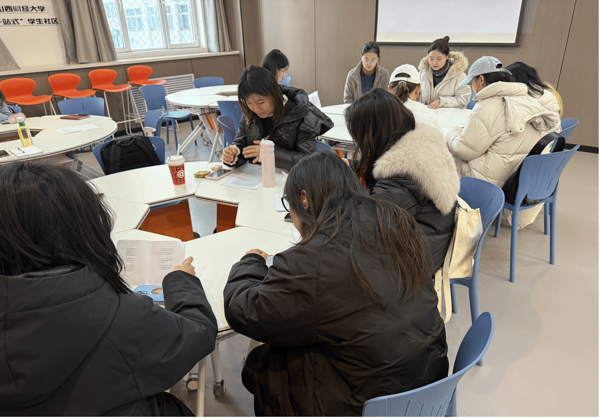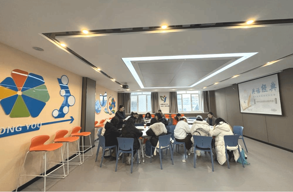 感悟思想伟力,把握精神实质。为深入学习贯彻党的二十大和二十届三中全会精神,引导全体学生坚持读原著、学原文、悟原理,充分发挥中德双语优势,阅读名著、传诵经典、传承文化,推动构建书香校园,12月17日,中德学院在“一站式”学生社区从游会客厅举办第二期“共话经典”读书会,共同阅读马克思经典名篇《青年在选择职业时的考虑》。