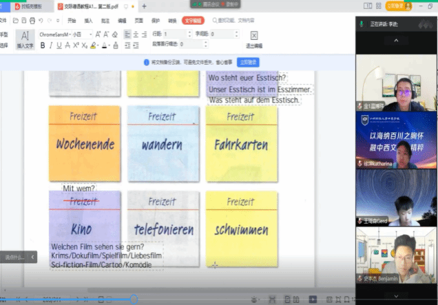 中德学院德语四班二零二二学年的第十七个教学周介于12.19-12.23日,28个课时,按既定教学计划本周涉及Studio 21-A1-Einheit 8 - Berlin sehen (第8单元:看见柏林)。本周4班26位同学能全部按时到课,除个别同学因疫情影响身体不适请求不开摄像头,但保证在课外,课上回应基本积极。但课后作业仍有个别补交、漏交及不交现象存在。