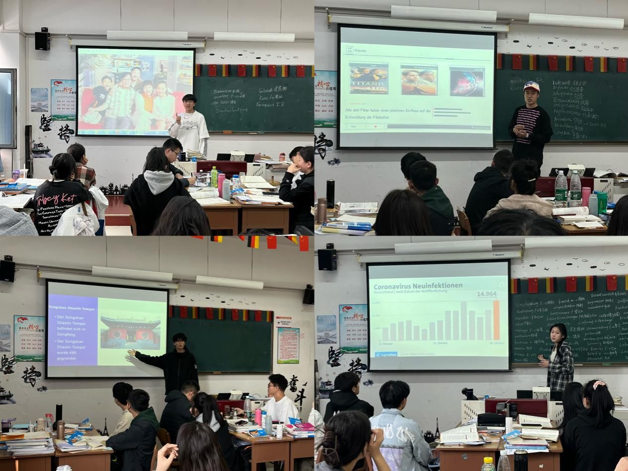 此外,在本学期的课程中我班增加了每天做报告的环节,由学生任选某一主题,上台对该主题进行三分钟左右的演讲,结束后和听众就该主题进行提问交流。刚开始大家选的题目多是关于家乡,美食或旅行等相对简单的话题。随着语言学习的不断深入,大家的选题逐渐丰富起来,例如:可再生能源,新冠对生活的影响,Chat GPT,柏林电影节,奥斯卡金像奖... 在这样的环节中,大家既可以用德语追踪时事,扩充词汇量,又能提高德语听力,激发大家学习的兴趣。