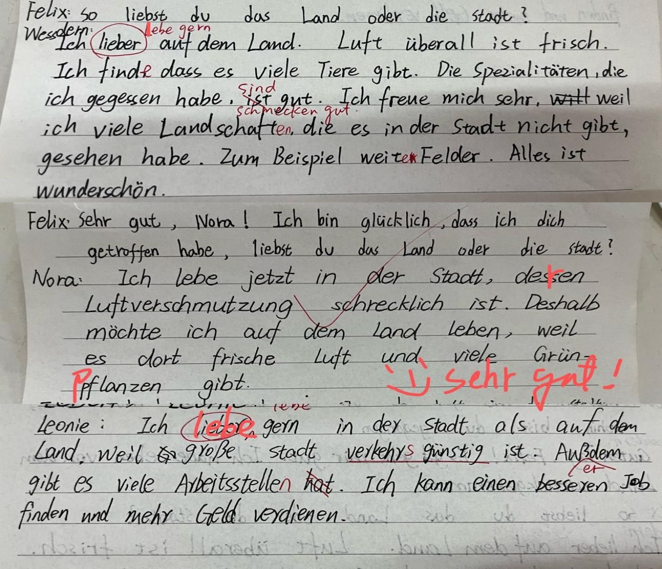 在第九教学周中,我班主要学习了A2的第七课:城市生活和农村生活。 “你更喜欢在城市生活还是在农村生活?” “城市生活和农村生活分别有哪些优缺点?” 带着这样的问题,学生们以对话的方式对关于城市和农村的图片进行了口头描述,过程中我要求学生至少使用1-2句学过的从句句型。描述之后由老师来纠正口语中的语法及词汇错误。最后让大家以书面作业的方式上交,批阅之后发下去学生传阅学习。在这样的过程中,学生们既交流合作,又互相借鉴好的德语表达,收获颇丰。