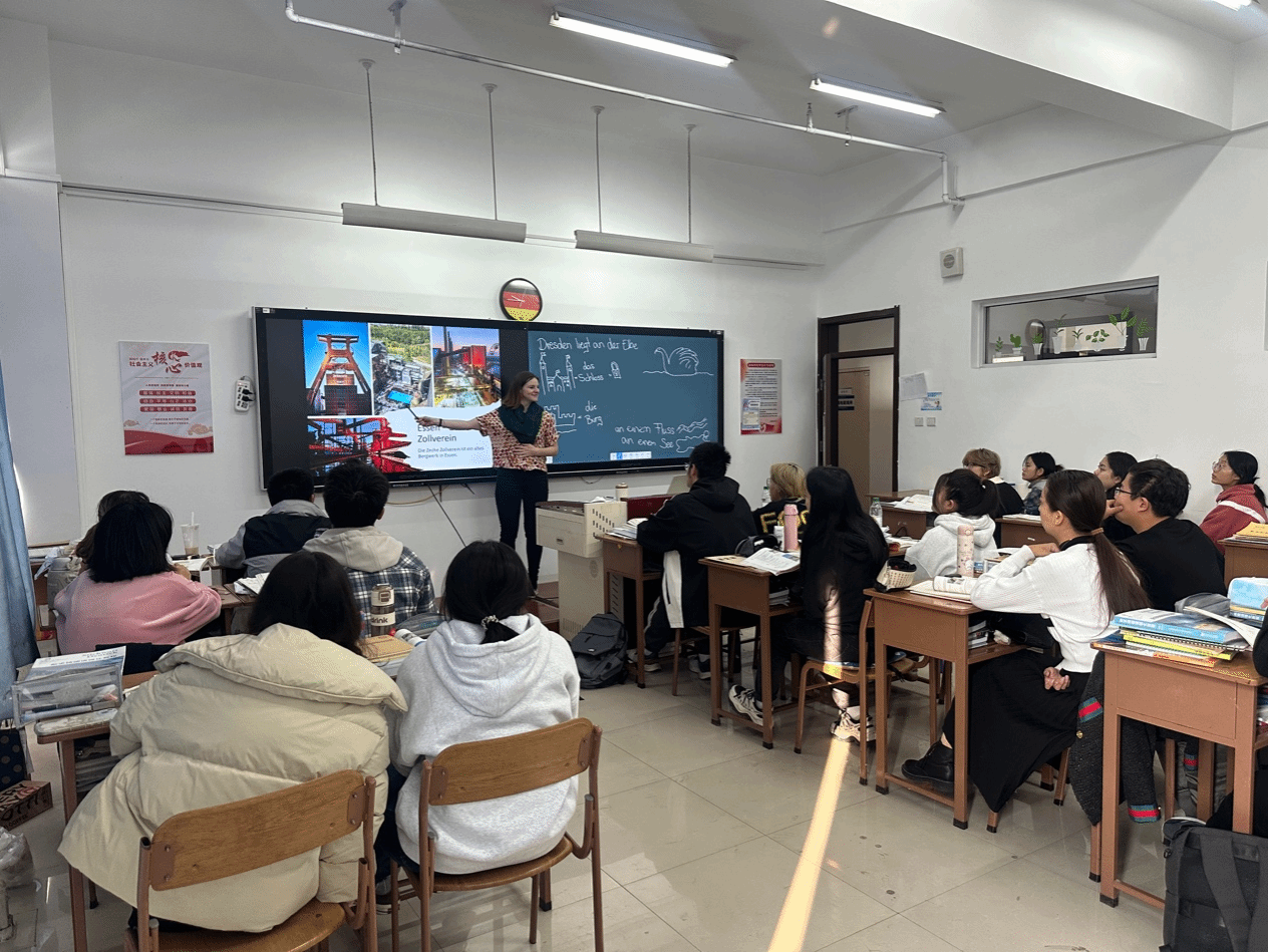 为开阔学生国际视野,激发学生德语学习热情,培养学生德语语感,中德学院德语教研室特邀德方教师Janika Steiner老师走进大一德语教学小班,与学生进行面对面的交流,营造纯正、沉浸式的德语学习氛围。