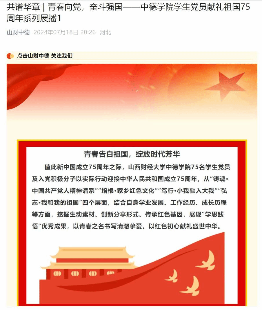 为深入学习党的二十届三中全会精神,全面贯彻落实党的教育方针,推动党史学习教育常态化长效化,引导青年学生传承红色基因、凝聚精神力量,教育中德学子讲好红色故事、传播中国声音,2024年暑期,中德学院学生党员聚焦“传承红色基因,学思践悟中国共产党人精神谱系”这一主题,结合学习和工作实际,深刻感悟伟大精神,开展专题系列推送,以实际行动庆祝新中国成立75周年。