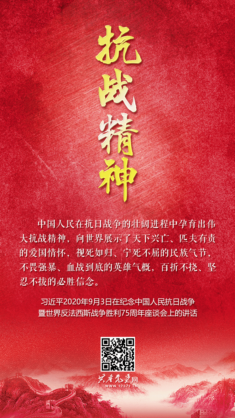1931年,日本侵略者发动九一八事变,进而侵占我国东北。1937年7月7日,日本侵略者炮轰宛平城、进攻卢沟桥,发动全面侵华战争。在中国共产党倡导建立的抗日民族统一战线的旗帜下,全国各族人民进行了艰苦卓绝的斗争,创造了弱国打败强国的光辉业绩。中国人民抗日战争,是中国人民反抗日本帝国主义侵略的正义战争,是世界反法西斯战争的重要组成部分,也是中国近代以来抗击外敌入侵第一次取得完全胜利的民族解放战争。2020年9月3日,习近平总书记在纪念中国人民抗日战争暨世界反法西斯战争胜利75周年座谈会上的讲话中强调,中国人民在抗日战争的壮阔进程中孕育出伟大抗战精神,向世界展示了天下兴亡、匹夫有责的爱国情怀,视死如归、宁死不屈的民族气节,不畏强暴、血战到底的英雄气概,百折不挠、坚韧不拔的必胜信念。