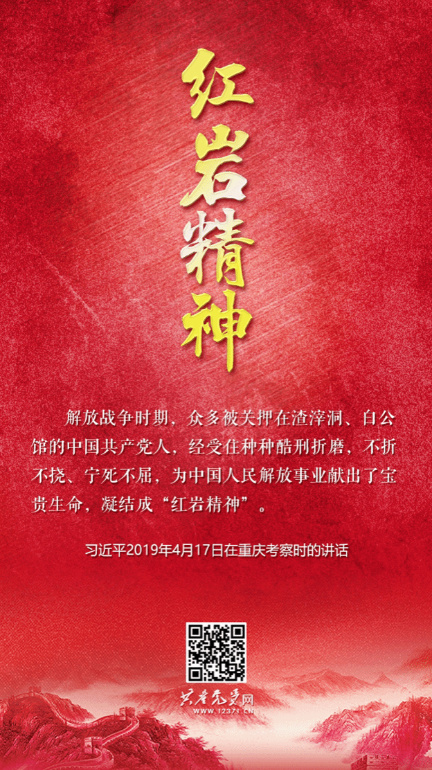 红岩,是抗日战争时期和解放战争初期中共中央南方局领导机关所在地和重庆谈判期间中共代表团驻地。毛泽东同志在这里进行了决定中国前途命运的重庆谈判,周恩来同志领导中共中央南方局在这里同反动势力展开了坚决斗争,红岩精神正是在这样特殊的环境中形成与发展的。全面抗日战争时期,以周恩来同志为代表的中共中央南方局在发展和壮大抗日民族统一战线的斗争中培育和形成了红岩精神;解放战争初期,在抗战胜利后的重要历史转折关头,为了国家前途和民族命运,毛泽东同志率领的中共代表团在重庆谈判斗争中丰富和发展了红岩精神;解放战争后期,面对敌人的威胁利诱,在极其艰难的条件下,以江竹筠、王朴、陈然等同志为代表的英烈群体在狱中斗争中进一步锻造和凝结了红岩精神。
