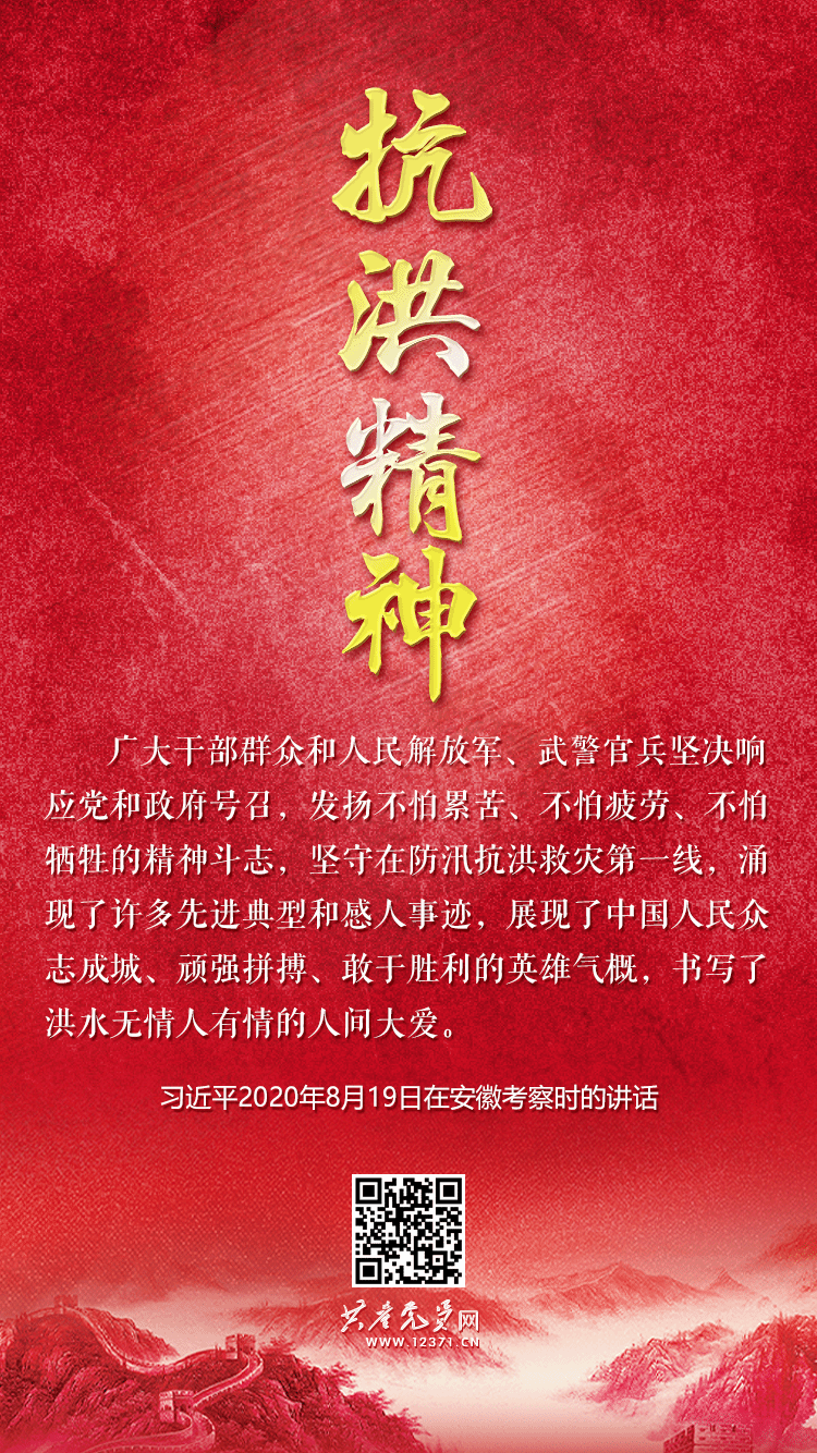 大江奔涌,抗洪精神接续传承。2020年,我们又一次取得抗洪抢险斗争胜利,习近平总书记在安徽考察时深入防汛救灾一线,指出“广大干部群众和人民解放军、武警官兵坚决响应党和政府号召,发扬不怕累苦、不怕疲劳、不怕牺牲的精神斗志,坚守在防汛抗洪救灾第一线,涌现了许多先进典型和感人事迹,展现了中国人民众志成城、顽强拼搏、敢于胜利的英雄气概,书写了洪水无情人有情的人间大爱”。2021年7月,河南等地持续遭遇强降雨,郑州等城市发生严重内涝,习近平总书记对防汛救灾工作作出重要指示,强调“要始终把保障人民群众生命财产安全放在第一位”“最大限度减少人员伤亡和财产损失”。历史和现实充分证明,无论什么样的风雨和风险挑战,都无法阻挡中华民族的前进步伐,都无法阻挡中国人民对美好生活、对伟大梦想的不懈追求。